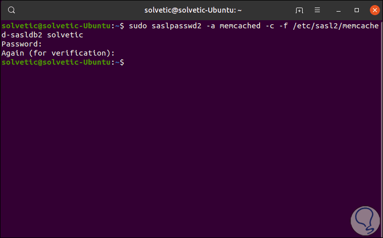 sudo saslpasswd2 -a memcached -c -f /etc/sasl2/memcached-sasldb2 solveticLos parámetros usados son: