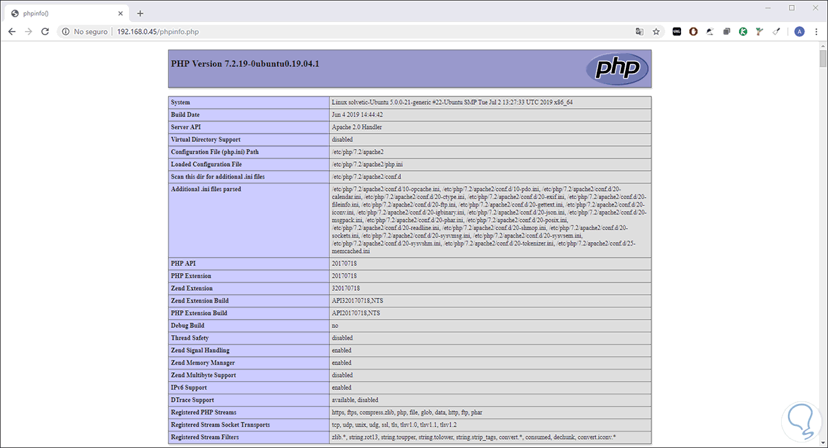 http://ip_servidor/phpinfo.phpEn primer lugar veremos detalles del servidor y de Apache con PHP: