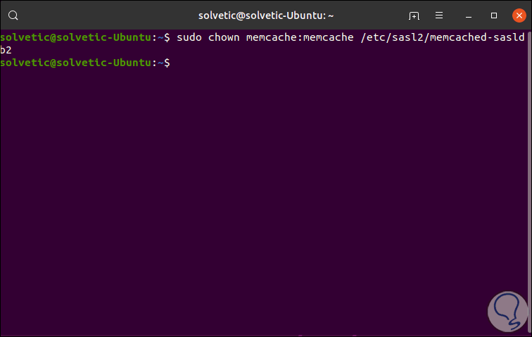 Por último vamos a otorgar al usuario memcache la propiedad sobre la base de datos SASL ejecutando lo siguiente: