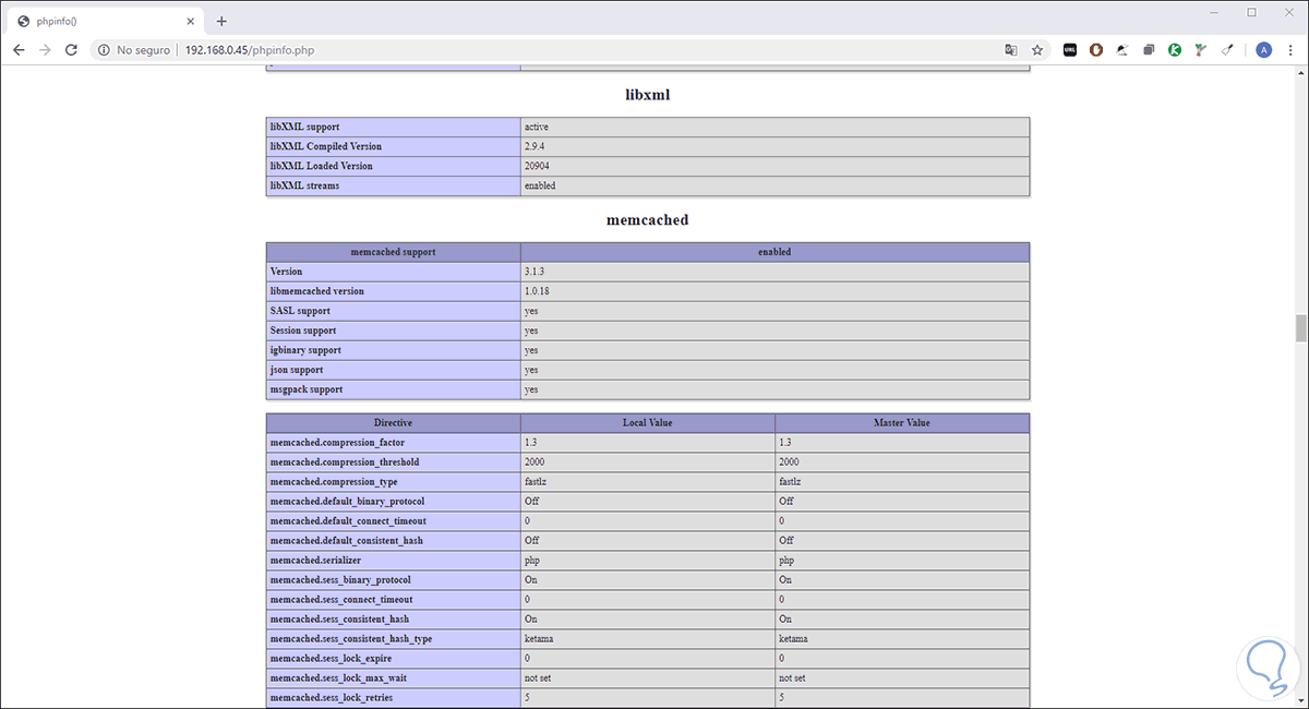 Más abajo encontraremos la sección Memcached con sus módulos: