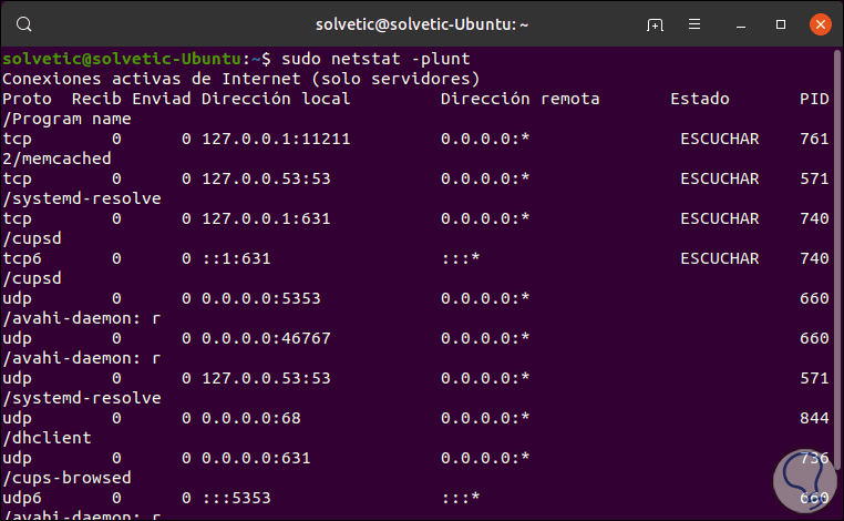 sudo netstat -pluntAllí ubicamos lo siguiente: