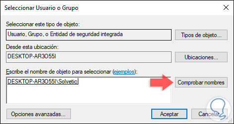 Allí debemos dar clic en la línea “Cambiar” ubicada en la parte superior y en la ventana emergente ingresamos el nombre del usuario deseado y pulsamos en “Comprobar nombres”: