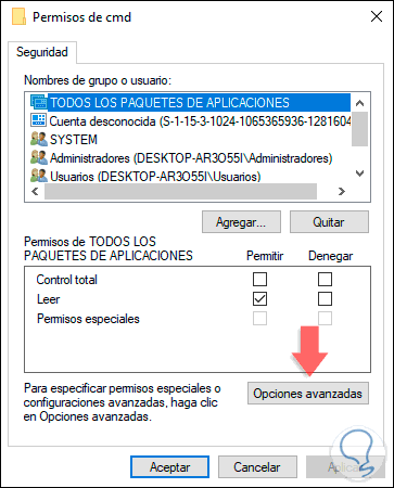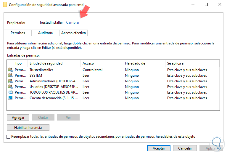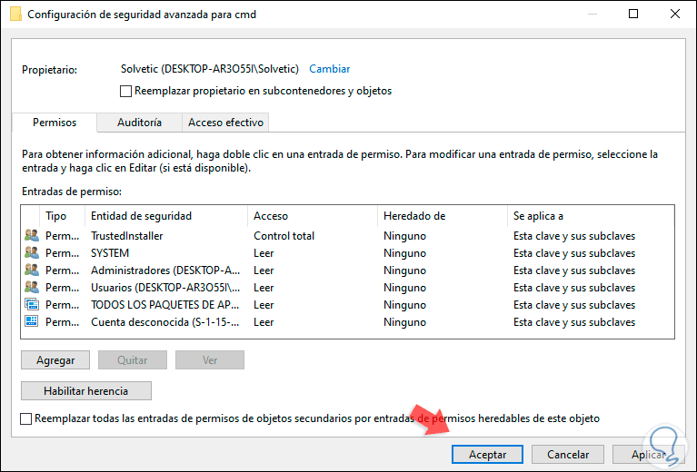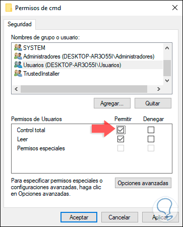 Luego ubicamos la línea con el nombre del usuario registrado y activamos la casilla “Control total”. Damos clic en Aplicar y luego en Aceptar de nuevo.