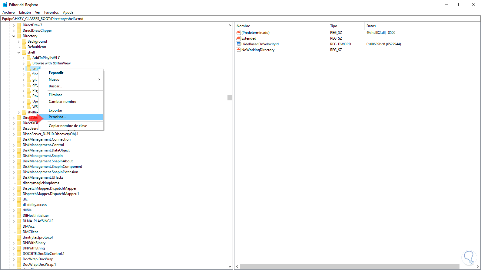 Allí damos clic derecho sobre la clave cmd y seleccionamos Permisos: