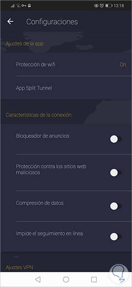 En la sección “Ajustes de la app” podemos activar la protección de la red Wi-Fi así como acceder a la protección de aplicaciones (App Split Tunnel):