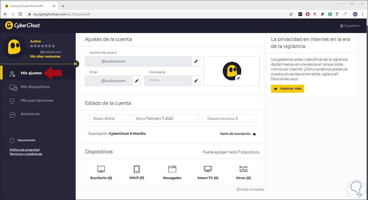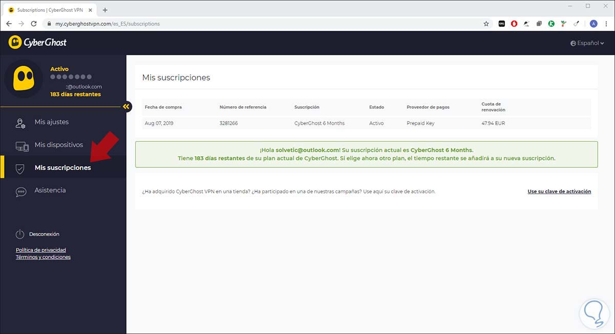 Una vez adquiramos un plan de CyberGhost, debemos ir al siguiente enlace para iniciar sesión con las credenciales (correo / contraseña) registrado: