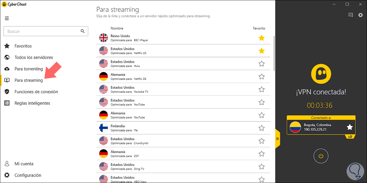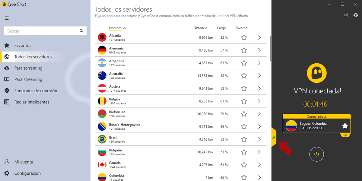 - Ver todos los servidores disponibles de CyberGhost VPN.