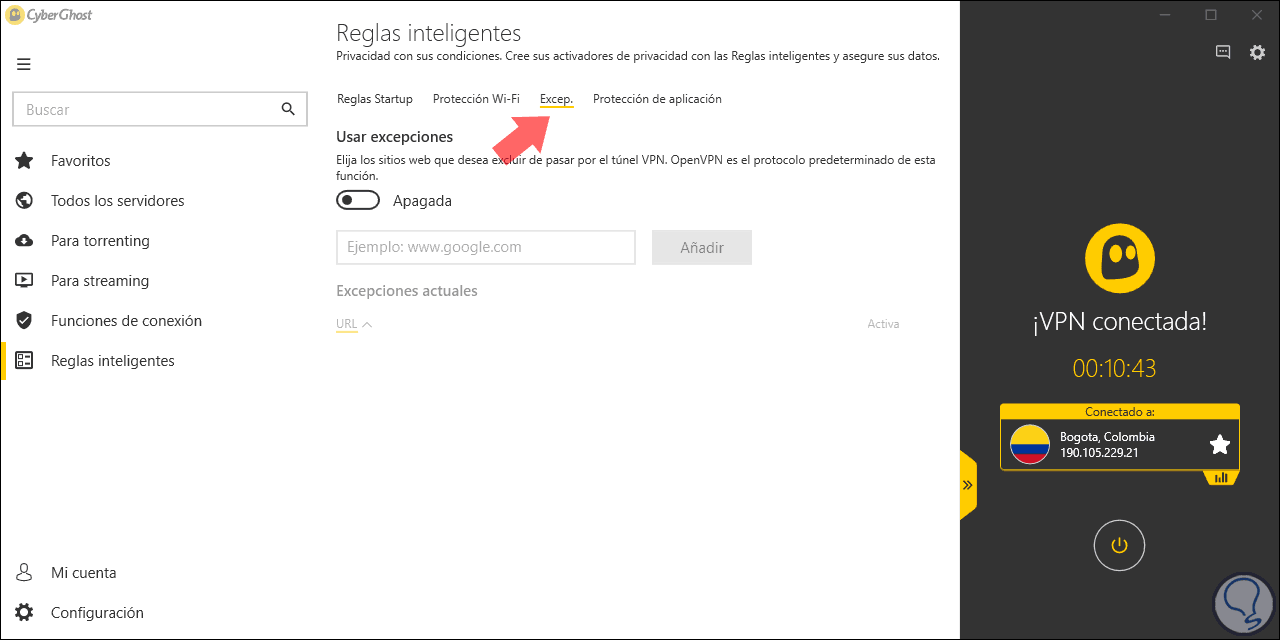 En la pestaña “Excep.” Podemos agregar sitios que no deben pasar por el túnel de VPN, son sitios de confianza: