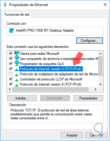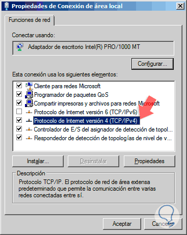 Luego seleccionamos la línea “Protocolo de Internet versión 4 (TCP/IPv4)” y damos clic en Propiedades: