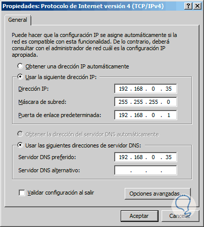 - En el campo “Servidor DNS preferido” ingresamos la misma dirección IP del servidor