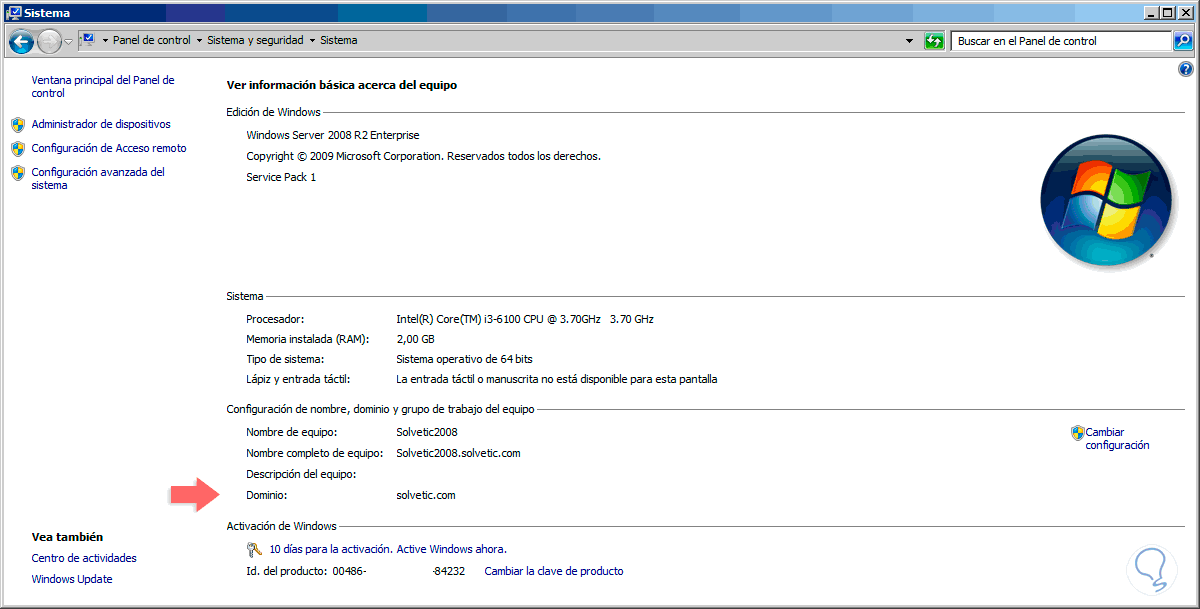 Damos clic en Aceptar para guardar los cambios. Ahora vamos a información del sistema para comprobar que usamos Windows Server 2008 R2 y el dominio al cual está unido el equipo: