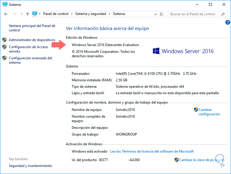 Ahora vamos al servidor Windows Server 2016 y en información del sistema validamos la edición usada: