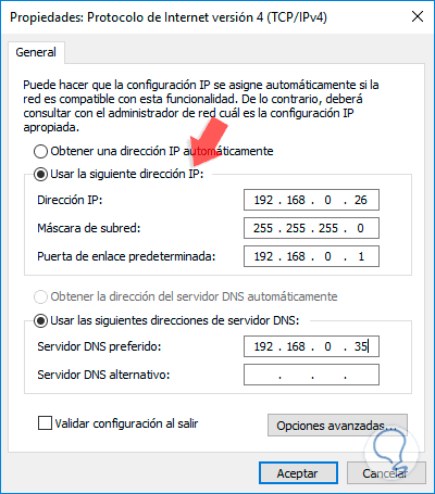 Ahora configuramos lo siguiente una vez activemos la casilla “Usar la siguiente dirección IP”. Pulsamos en Aceptar para aplicar los cambios.