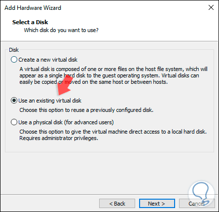 En la próxima ventana activamos la casilla “Use an existing virtual disk”: