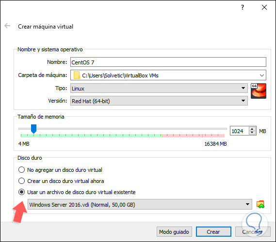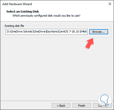 En la parte inferior activamos la casilla “Usar un archivo de disco duro virtual existente” y pulsamos en el ícono de examinar y será desplegado lo siguiente: