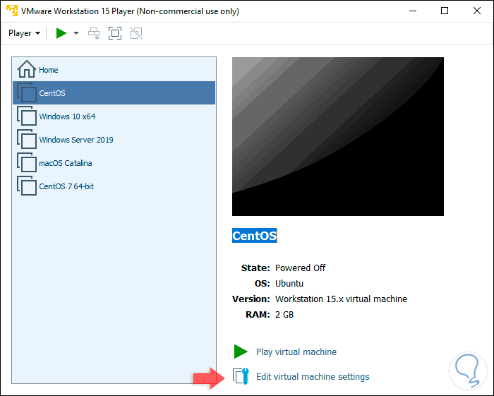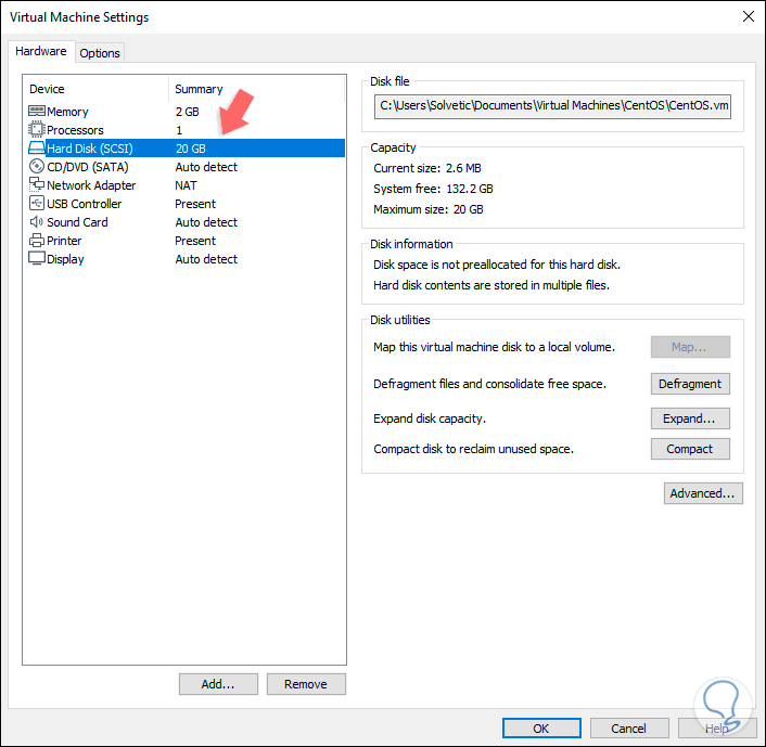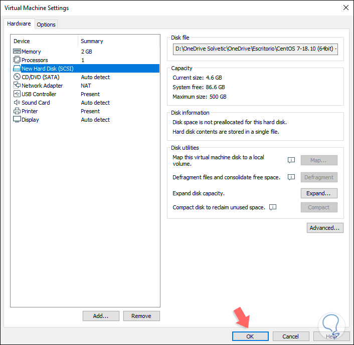 Allí seleccionamos la línea “Edit virtual machine settings” y en la ventana desplegada iremos a la sección Hard Disk: