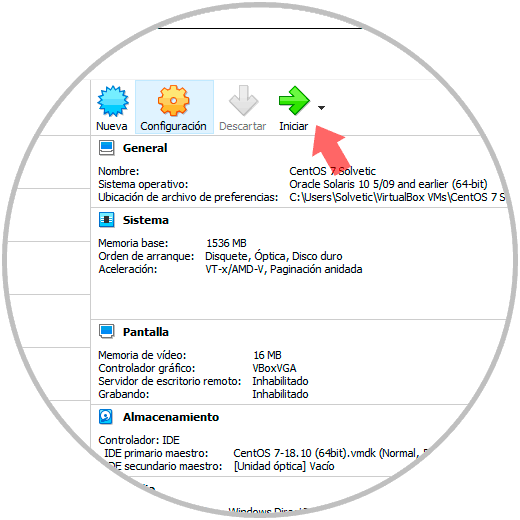 Pulsamos en el botón “Crear” y se procederá con la creación de la máquina virtual. Allí simplemente debemos dar clic en “Iniciar” para proceder con la ejecución y configuración de la máquina virtual.