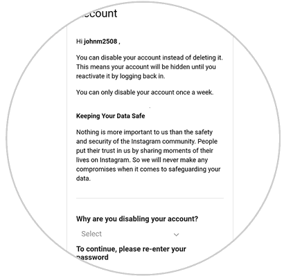 - Definir la razón por la cual se ha de desactivar la cuenta de Instagram
