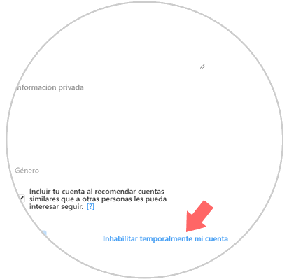 Seremos redireccionados a la siguiente ventana. Allí encontramos en la parte inferior la línea “Inhabilitar temporalmente mi cuenta”, damos clic allí.