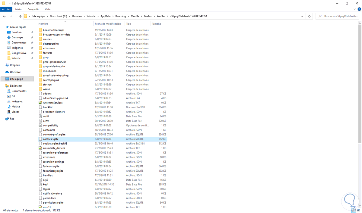Al acceder al perfil deseado encontramos el archivo cookies.sqlite: