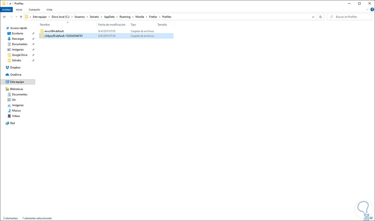 C:\Users\usuario\AppData\Roaming\Mozilla\Firefox\ProfilesAllí encontramos las carpetas con los perfiles de usuario actuales: