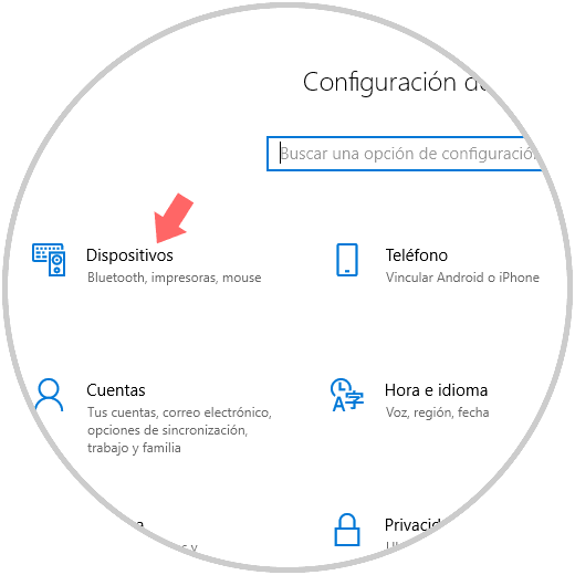 La aplicación Configuración es un punto central desde donde podremos administrar muchos parámetros del sistema. Para hacer uso de esta opción iremos al menú Inicio y allí seleccionamos Configuración, veremos lo siguiente. Allí vamos a la categoría “Dispositivos”