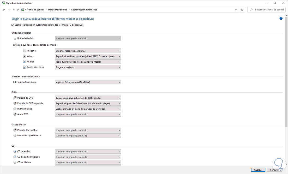 Así, hemos visto las formas disponibles para activar o no la reproducción automática en Windows 10 y definir que acción se ha de realizar con cada medio.
