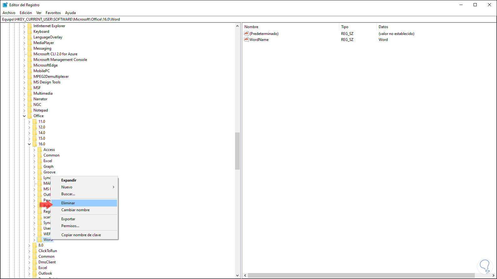 Una vez seleccionemos la clave Word damos clic derecho sobre ella y seleccionamos “Eliminar”: