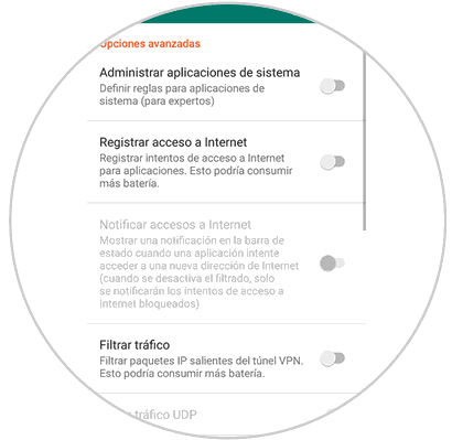Desde las opciones avanzadas podemos administrar las aplicaciones del sistema, filtrar el tráfico, etc: