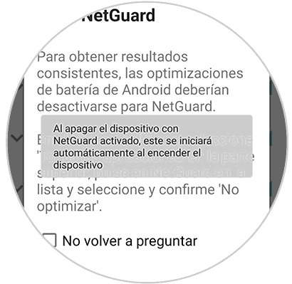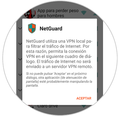 Hasta aquí todo muy interesante pero debemos activar el uso de NetGuard, te aclaramos que NetGuard hace uso de una VPN local la cual garantiza el tráfico de red. Para activar NetGuarde impedir que las aplicaciones accedan a la red debemos pulsar en el interruptor ubicado en la parte superior y veremos el siguiente mensaje:
