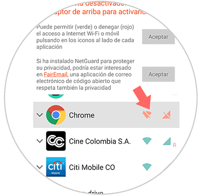 De primera mano para impedir que una aplicación acceda a la red simplemente basta con pulsar sobre el ícono de red móvil o Wi-Fi para el respectivo bloqueo: