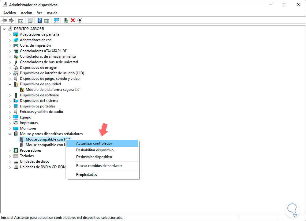 Una vez accedamos al Administrador, vamos a la línea “Mouse y otros dispositivos señaladores”, allí daremos clic derecho en el controlador del mouse y seleccionamos “Actualizar controlador”: