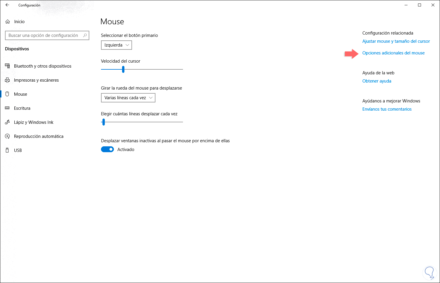 Allí seleccionamos la categoría “Dispositivos” y en la siguiente ventana vamos a la sección “Mouse” y allí damos clic en la línea “Opciones adicionales del mouse”: