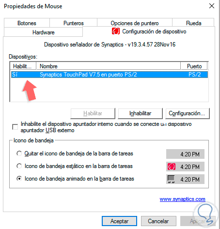 En la ventana desplegada de las propiedades del mouse iremos a la pestaña “Configuración del dispositivo”, luego seleccionamos el controlador del touchpad y valida que el mismo se encuentra habilitado, de no ser así damos clic en el botón “Habilitar”. Luego pulsamos en Aplicar y luego en Aceptar para aplicar los cambios.