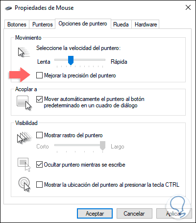 Para esto, vamos de nuevo a la ruta anterior indicada “Opciones adicionales del mouse” y esta vez vamos a la pestaña “Opciones de puntero” y allí desactivamos la casilla “Mejorar la precisión del puntero”: