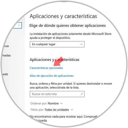 En la sección “Aplicaciones y características” veremos lo siguiente. Damos clic en la línea “Características opcionales”