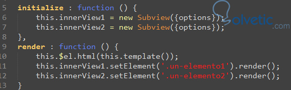 Aquí vemos como primero inicializamos nuestras vistas anidadas, luego en el momento de hacer el render de la vista principal hemos colocado las sub-vistas creadas y con el método setElement hacemos que se añadan al contenedor correspondiente.