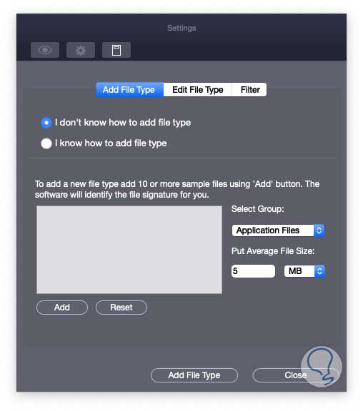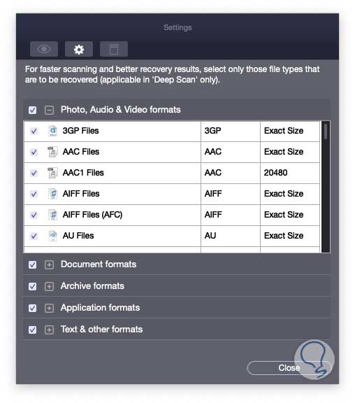 En la pestaña Configuración podemos especificar aspectos como el tipo de formatos a analizar tanto de audio, video, documentos, imágenes o correos: