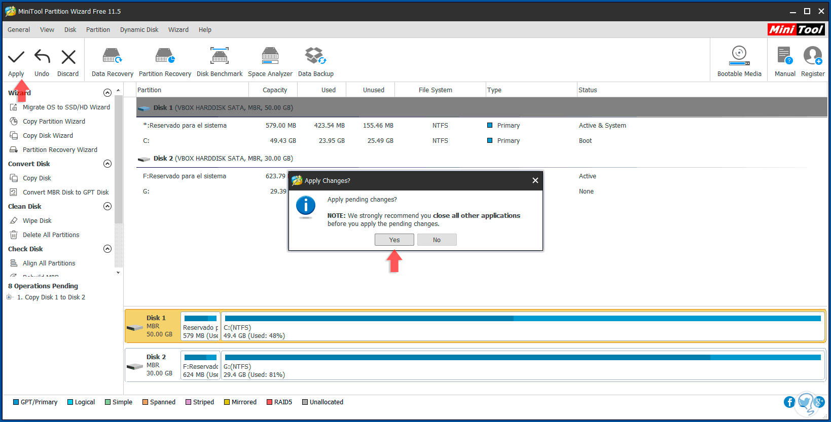Seremos redireccionados a la ventana principal de Partition Wizard y debemos pulsar en el botón Apply ubicado en la parte superior para ver lo siguiente: