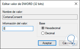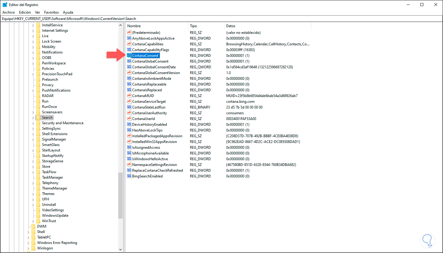Pulsamos en Aceptar para aplicar los cambios y en la ventana principal encontramos un valor DWORD existente llamada CortanaConsent: