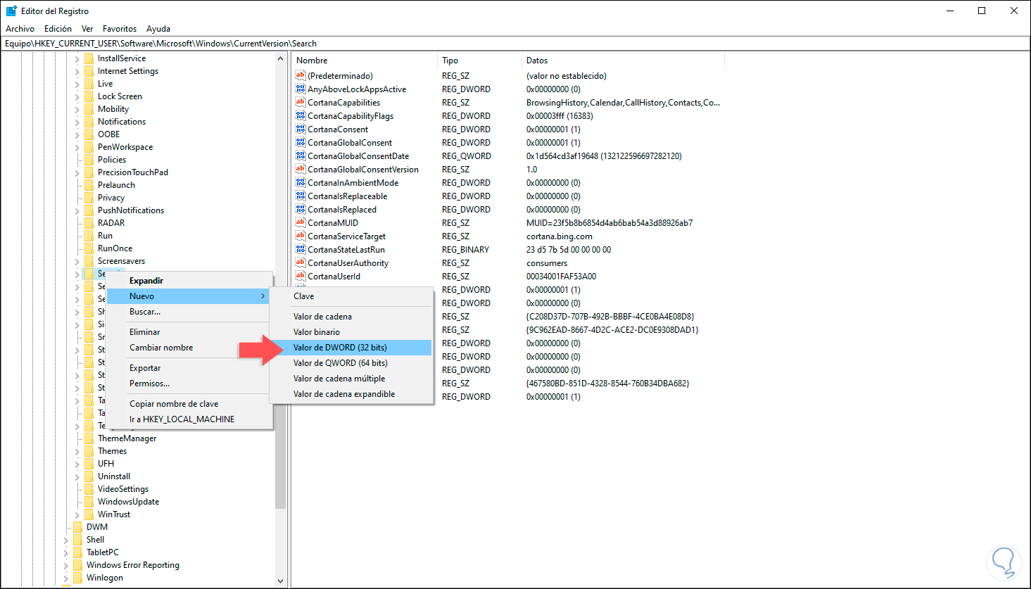 Allí damos clic derecho sobre la clave Search y seleccionamos la opción Nuevo / Valor de DWORD (32 bits):