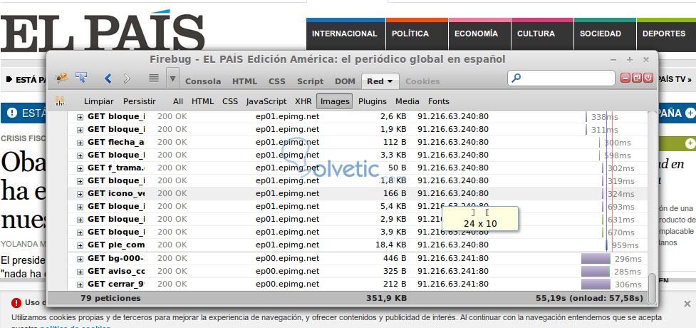 Podemos ver a medida que se carga una web como bajan las imágenes o cualquier parte del contenido, cuanto tiempo y que peso ocupa, vamos a hacer una prueba con el diario elpais.com vemos que le toma 55 segundos cargar completamente y consume 351 kb solo de imagenes, seguramente se debe a que también carga varios enlaces externos de publicidad.