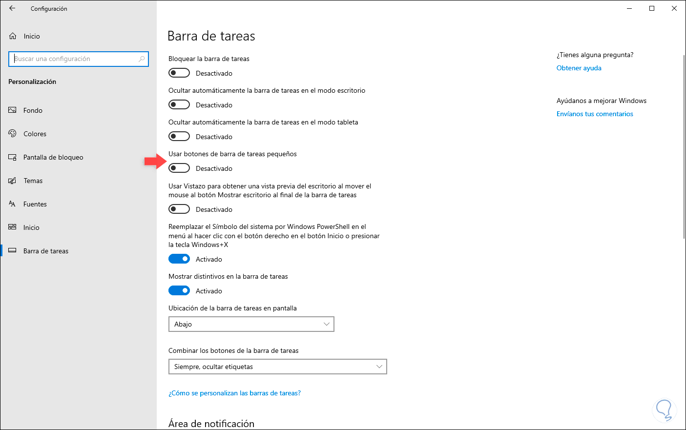 Podemos activar el interruptor “Usar botones de barra de tareas pequeños” para editar el tamaño de los iconos a este tamaño: