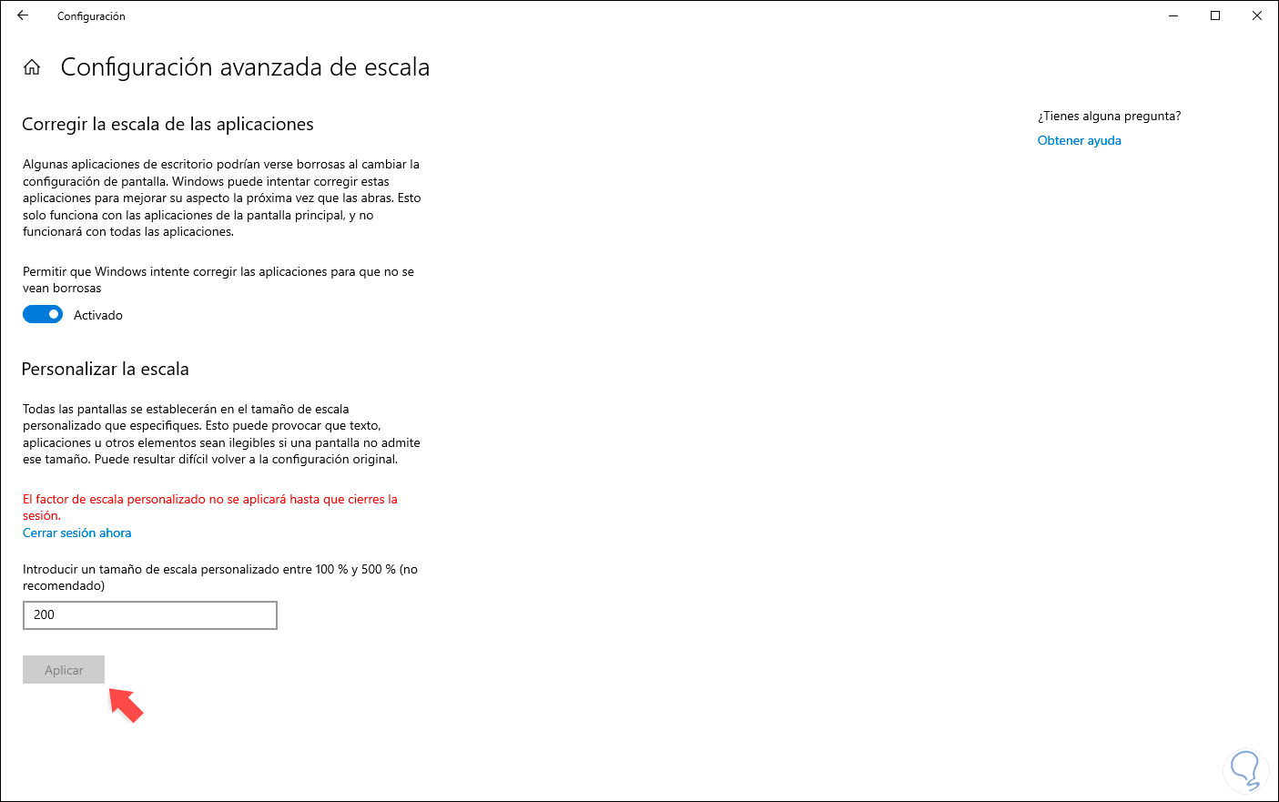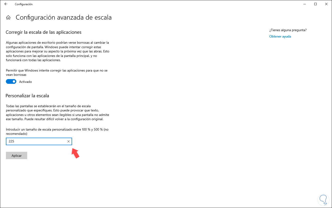 Alternativamente podemos dar clic en la línea “Configuración avanzada de escala” y en el campo “Introducir un tamaño de escala personalizado entre 100% y 500% “para definir el tamaño deseado:
