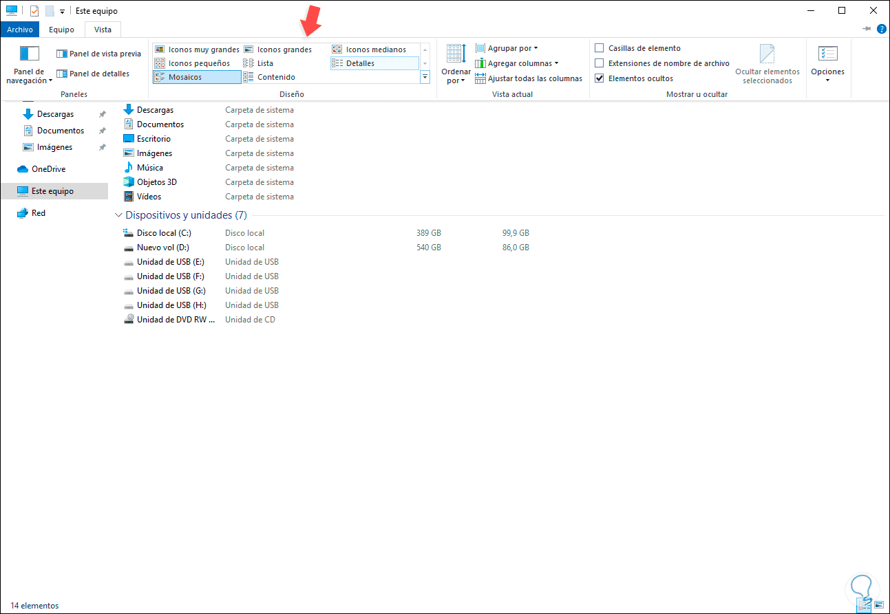 Para editar el tamaño de los iconos en el Explorador de archivos de Windows 10 debemos ir al menú Ver y allí dispondremos de algunas opciones en el grupo Diseño como:
