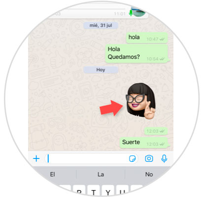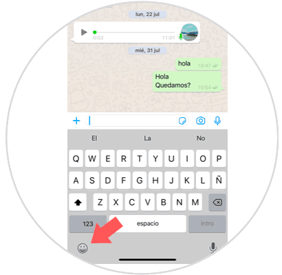 Lo primero que vas a tener que hacer es entrar en la App de WhatsApp. Despliega el teclado y toca el icono de la carita de la esquina inferior izquierda.