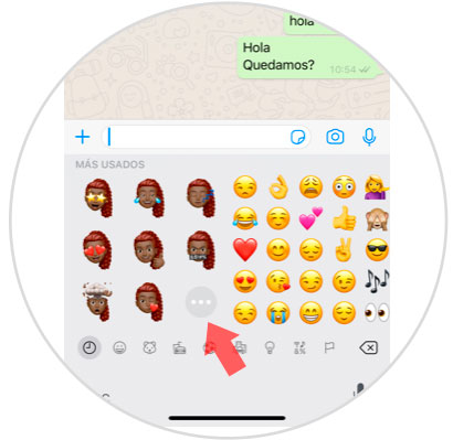 Aquí te van a aparecer los iconos que puedes usar. Desliza hacia la izquierda y verás los Memojis ya creados para usar como Emoji. Pulsa en el icono de 3 puntos suspensivos para ver más opciones.