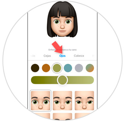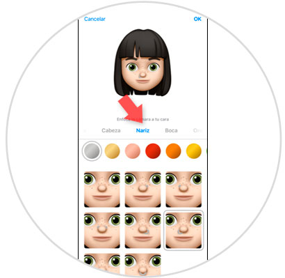 Aquí vas a poder seleccionar los diferentes aspectos para crear tu Memoji personalizado, pudiendo cambiar el color y su intensidad y añadir detalles: