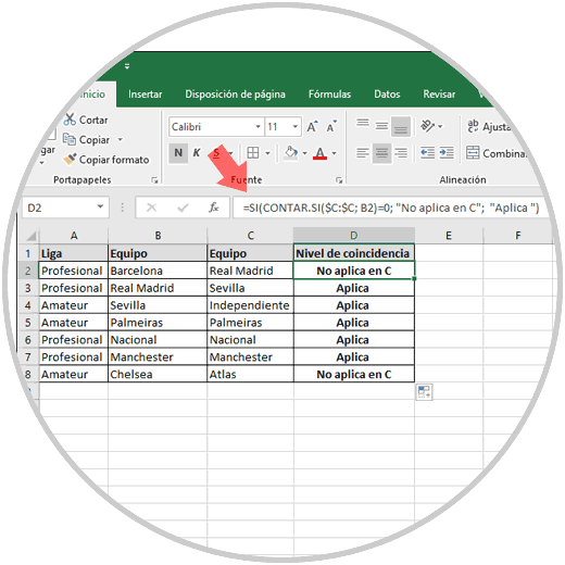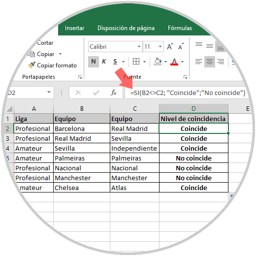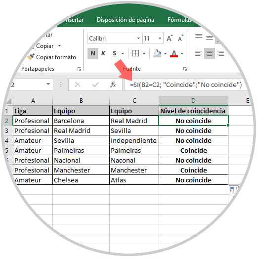 Podemos ver que en donde esta dos veces el mismo término se desplegará el mensaje “Coinciden”, si no coincide en ninguna fila veremos “No Coinciden”.