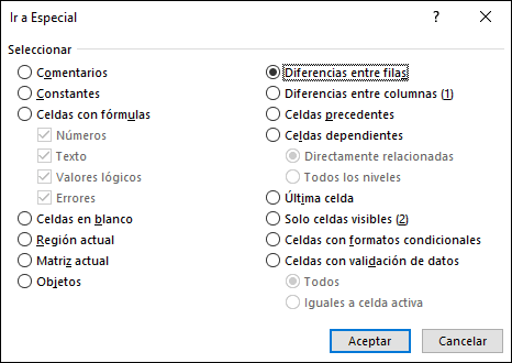 En el asistente que se desplegará debemos activar la casilla “Diferencias entre filas”: